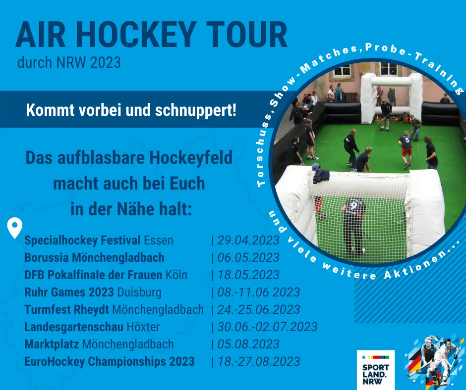 Gemeinsam mit dem Sportland NRW gehen wir mit unserem AirHockey Feld auf Tour! Bei verschiedenen Veranstaltungen in NRW können sich hier Interessierte am Hockey ausprobieren und Vereine können neue Mitglieder gewinnen.